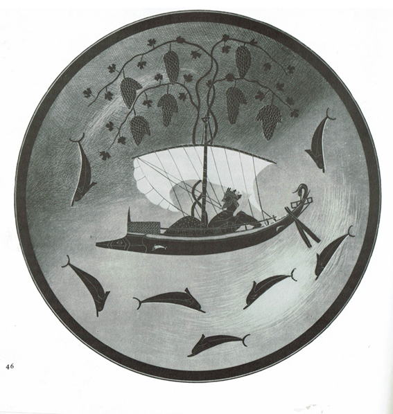 ここで語られている「小舟の主の葡萄摘み人」こそ、ギリシア神話の酒の神ディオニュソスである。酒の神ディオニュソスは、熱狂の神、変貌の神、再生の神でもあった。ギリシア神話ではそのディオニュソスがエーゲ海のナクソス島に渡ろうとした時の話として、海賊たちに捕らわれたという話がある。すると、ディオニュソスは獅子に変身し、帆柱と櫂とを蛇に変え、船を葡萄の蔓で覆ったという。これに驚いた海賊たちは狂って海中に落ち、イルカに変身したという。ミュンヘン古代美術博物館蔵のエクセキアスの壺にはこの場面が描かれているともいわれている。先に引用した『ツァラトゥストラはかく語りき』の第三部「大いなる憬れ」で語られた光景は、このエクセキアスの壺に描かれた光景を想起せしめる。ここに描かれたイルカたちは、ディオニュソスの乗る船を囲み、ディオニュソスを讃えて、踊躍乱舞しているようにみえる。ディオニュソスの秘儀ではディオニュソスの女性信奉者のマイナスたちが踊り狂ったといわれているが、エクセキアスの壺に描かれたイルカたちはそのマイナスたちの化身であるかもしれない。