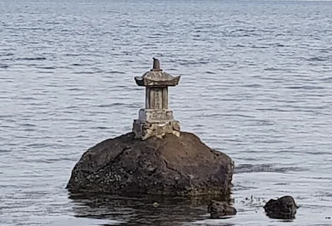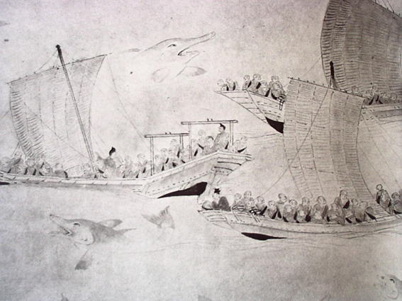 日本でも『遊行上人縁起絵』に日本のエーゲ海(多島海)といわれる瀬戸内の海に多数のイルカが出現し、一遍の舟の周りで乱舞した話が載っている。それは正応元年の師走のことであった。伊予大三島の大山祗神社で念仏法楽を行じた一遍とその弟子たちは、そののち今治の大山祗神社の別宮へ船で向っていた。」その途上、「海鹿といふ大魚、数をしらず浪をたてゝ船の舳艫にはねをどりけり。すこしも人をおそるゝ事なく、半時許ありてうせにけり」という。一遍の舟の周りで「海鹿」が跳ね踊っている様子はまるで踊り念仏を踊っているかの様に見えたにちがいない。ここで言われている「海鹿」とはイルカのことである。一遍とイルカとの出会いはこれがはじめてのことではなかった。 伝説によれば、一遍が未だ弟子を持たず独り九州に遊行の旅にでかけた時のことである。はじめて九州に降り立った速見ヶ浦(別府)で、一遍が「南無阿弥陀仏」と称えていると、イルカが岩にあがって一遍の称名に聞き入ったという。以来、速見ヶ浦は上人が浜とよばれ、イルカがあがった岩は海鹿聴聞岩と呼ばれている。上人が浜ではイルカが一遍の称える「南無阿弥陀仏」に聞き入ったが、来島海峡では一遍はイルカの踊る「南無阿弥陀仏」に見入り、イルカの踊る「南無阿弥陀仏」に魅入られたにちがいない。