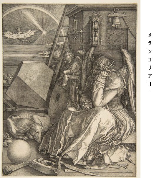 聖ヒエロニムスが室内で坐しているのに対して、『メランコリアⅠ』の「憂鬱」の擬人化した「天使」は戸外に座している。天使は頬杖をついて思索に没頭しつつも、鋭い視線を前方へと放ち、自然を鋭く観察しているように見える。手には、距離を測るコンパスが握られ、背後の壁には、時間を計る砂時計と重さを量る天秤が懸けられている。『メランコリアⅠ』の画面には、その他、魔方陣、多面体、球も見られる。これらの道具立ては、自然を数と幾何学的図形とによって捉えようとする近代の科学的精神を示唆しているかのようである。しかし、『メランコリアⅠ』の天使は単に自然を観察、観測するだけではない。その擬人物の周りには、かんな、のこぎり、かなづち、くぎなどの大工道具も描かれている。『メランコリアⅠ』の天使は、自然を客観的に観察、観測するだけにとどもらず、それ基づいてさらに企画を立て、これからこれらの大工道具を使って何かを製作しようと思案しているようにもみえる。そうだとしたら、その擬人物の鋭い視線は外なる自然へと投げかけられているだけでなく、将来に向けても投げかけられているといってもよいかもしれない。しかしその将来は明るく開けたようにはみえない。黄昏の不気味な光芒のなかに、コウモリが飛び立っている。コウモリは伝統的に「憂鬱」と結びつれられている。ヘーゲルの有名な言葉に「ミネルバのフクロウは黄昏と共に飛び立つ」という言葉があるが、黄昏と共に飛び立つのは、なにもミネルバのフクロウばかりではない。「憂鬱」の象徴たるコウモリもまた、黄昏とともに飛び立つのである(ラテン語の「コウモリ」vespertitioは「黄昏」vesperに由来する)。