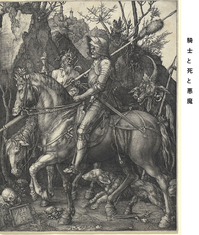 『聖ヒエロニムス』では「観想の生活(bios theretikos)」の人物が、『メランコリアⅠ』では「製作の生活(bios poietikos)」の人物が描かれているといえるとしたら、『騎士と死と悪魔』で描かれている人物(騎士)は、「実践の生活(bios praktikos)」の人物が描かれているといえるであろう。前二作に描かれている人物がいずれも坐り込んでいるのに対して、『騎士と死と悪魔』の騎士は馬にまたがり、自らの道を歩んでいる。