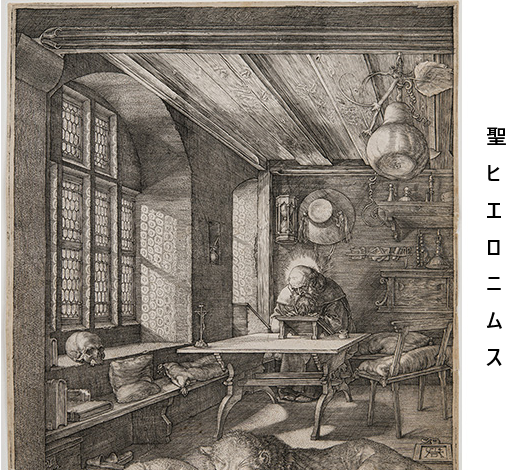 ドイツのルネッサンス期の画家デューラーの三大銅版画とされる作品に『聖ヒエロニムス』(1514年)、『メランコリアⅠ』(1514年)、『騎士と死と悪魔』(1513年)という作品がある。ヒエロニムスは聖書のラテン語訳をした教父として知られる。デューラーの『聖ヒエロニムス』では、そのヒエロニムスが修道院の一室と思われる静謐な部屋で、机の前に座して、視線を机の上に落として聖書の翻訳に没頭しているところが描かれている。画面手前にはヒエロニムスが刺を抜き救ってやったというライオンが寝そべっている。