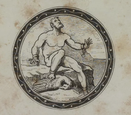 この本の扉には『解放されたプロメテウス』の図が装幀画として掲載されていた。プロメテウスは、ギリシア神話によれば、巨人族の一人で、野生の人間の悲惨な生活を憐れんで、天上から神々の火を盗んで人間に与えたという。これに怒ったゼウスはプロメテウスをカウカソス山の山頂に鎖で縛り、大鷲にその肝臓を啄み喰わせた。しかし、夜の間にプロメテウスの肝臓は再生したので、プロメテウスは死ぬこともなく、肝臓を啄まれる苦痛は、死をもって終わることなく、生死を超えて永遠に続くかのように思われた。しかし、ずっと後になって、英雄ヘラクレスが現れ、大鷲を射おとすにおよんで、やっとプロメテウスは解放されたという。