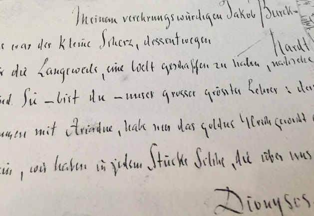 ニーチェは、「新たな神」の誕生に狂おしくも憬れ 狂気の淵で自らが古代ギリシアの神、ディオニュソス神として変容するのを夢見たのではないだろうか。ニーチェは、狂気の淵に陥った1889年に恩師ブルックハルトに宛てた書簡に「ディオニュソス」と署名している。