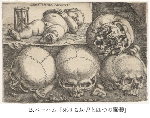 ヨーロッパでは古くから人々に「死への先駆」を促す警句として「メメント・モリ(死を憶えよ)」というラテン語の句があった。「メメント・モリ」をモチーフとした絵画も数多く描かれてきた。その際ふつう死の象徴として髑髏が用いられた。まさに「メメント・モリ」をモチーフとして描かれた絵画では死の象徴として用いられたのは、すでに死んでしまった姿、「もはや生存していない」姿であった。私たちはその一例を16世紀ドイツの画家B.べーハム(Barthel Beham1502~1540)の『死せる幼児と四つの髑髏』に見ることができる。四つの髑髏のそばで眠る幼児は、ハイデッガーが『有と時』で引用した「人間は生をうけるやいなや、人間はすでに死ぬるに充分な歳になっている」という言葉を表しているかのようにも見える。その幼児の上には「死はすべてを等しうす(mors omnia aequat)」とラテン語の箴言が記されている。現世の生活は王侯、貴族、庶民で大きく異なっても、死はすべての人に一様に訪れ、誰もが等しく髑髏になってしまう。赤子も、老人もすべての人は等しく確実に死ぬ。