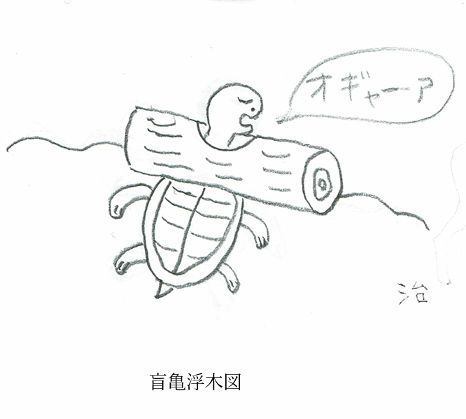では、生の誕生の瞬間とは如何なる瞬間であろう。仏教では、『雑阿含経』巻第一五などで、人間に生まれる瞬間について、次のような比喩譚を使って語られている。まだ、陸地が出現せず大海だけが限りなく広がっている太古の話である。大海の底に潜み百年に一度海上に頭を出す寿命無量の盲目の亀がいる。一方海上には一つの穴の空いた浮木が風の吹くままに西、東と漂っている。私たちが人間に生まれるのは、この亀が浮かび上がった時に偶々その頭がこの穴に出遇うように偶然のことだという。いや、偶然の瞬間に生まれるのは、人間だけではない。そもそも総じて無限の宇宙空間のうちにあって、生命を宿す星、この地球が誕生したのも偶然に偶然が重なった結果だともいえよう。「Memento vivere(メメント・ヴィヴェレ)」(生を憶えよ)という警句も、偶然に偶然を重ね生まれてきた生に想いを致しながら生きよと命じているとも解釈できよう。たとい将来に何の希望を見ることのできない絶望の大海にあっても、生の誕生の瞬間に想いを致して生きていくなら、人は偶然の申し子として偶然の生を愛おしみ、偶然と戯れ、生きていくことができるだろう。