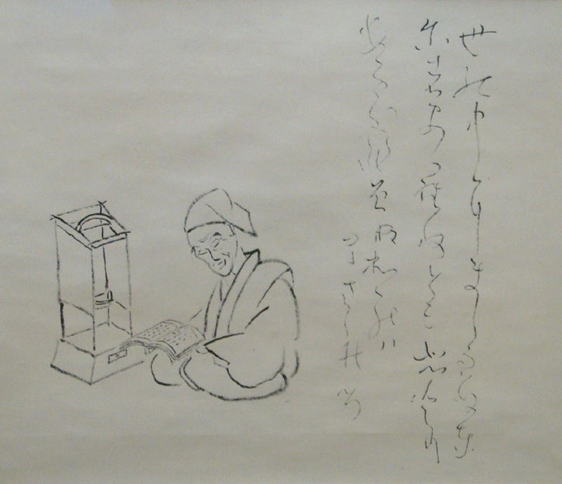 この歌は良寛自筆の自画像といわれる図に讃として添えている。行燈の蔭で袖なしを着て、頭巾をかぶり、膝に書物を広げて読んでいるところが描かれている。行燈が逆遠近法で描かれており、良寛の視線が注がれている書物へと、この図を見ているもの者の視線も導かれるように描かれている。書物に眼を落す良寛の口はわずかに開かれ、口に出して詠んでいるようにもみえる。自作の和歌でも詠んでいるのだろうか。戸外で子供たちと共に毬つきをしたり、人と共に踊ったりするのもいいが、草庵に籠り独りしずかに時を過ごすのがなにより自分の性に合っているというのであった。