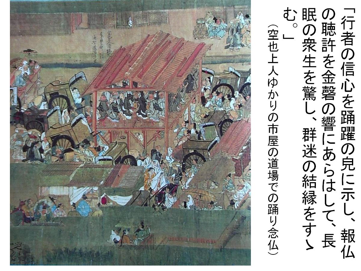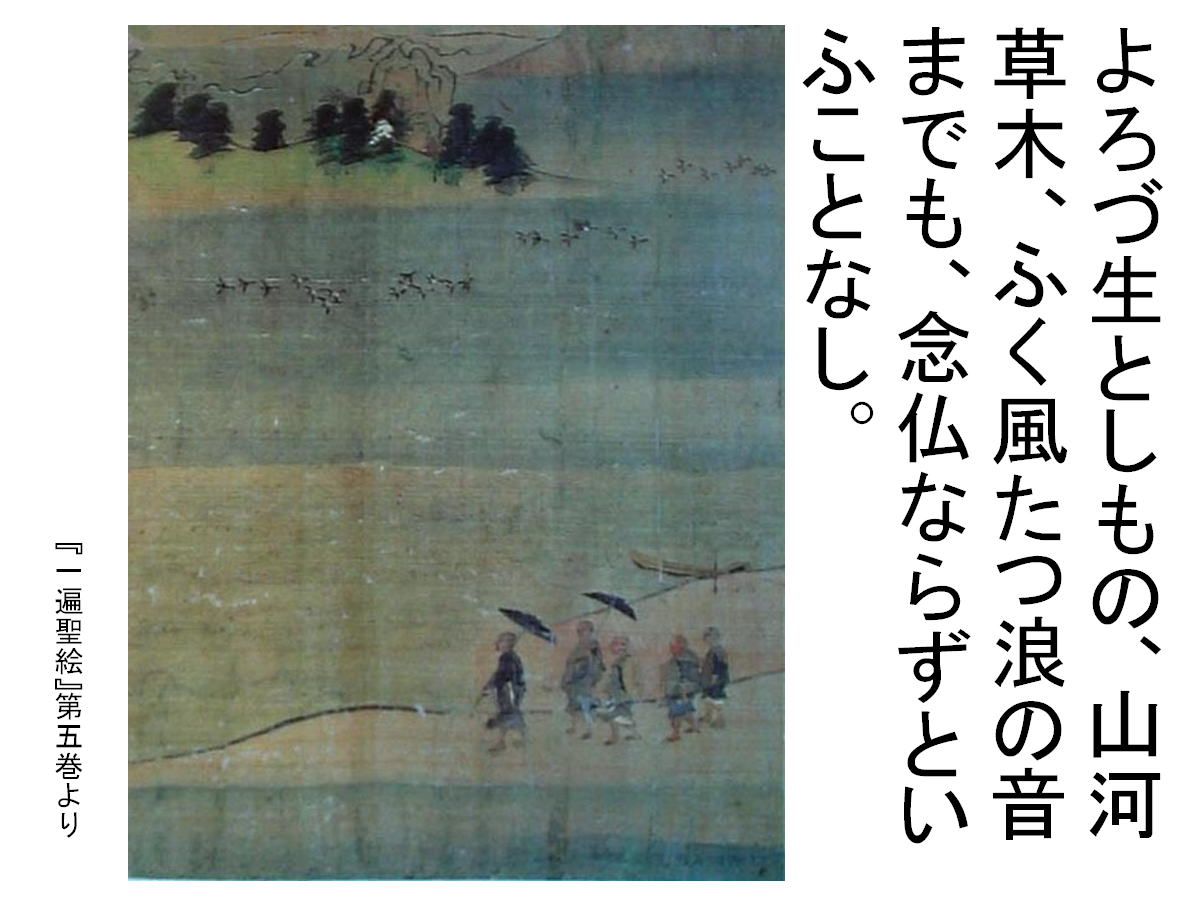 普通よく説かれる西方浄土は、善行、あるいは厳しい修行を積んだ人や信心の篤い人が死後に行くことのできる世界であり、そこでは絢爛たる宝楼珠閣がたち、芳香がただよい、美しい楽の音が流れ、天人が舞い踊り、阿弥陀仏のありがたい説法を聞くことができるという。しかし、一遍上人の説く「浄土」はこのような死後のあの世の世界ではなかった。一遍上人にしたがえば、私たちが一切のことをうち捨てて念仏を称えるなら、いま現在の山河草木、吹く風、立つ浪のことごとくが、唱和して念仏を称え、南無阿弥陀仏となって現れ、私たちが現に生きている世界が、そのままで浄土に変容するというのであった。それはまさに「念仏三昧」ともいうべき世界である。