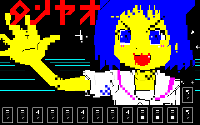 No.108:タンヤオ 昔からあるネタですが、キャラクタは、漫画「咲」に出てくる池田という天然キャラです。 麻雀パイはハドソンソフトのMZ-80用の麻雀のパイです。