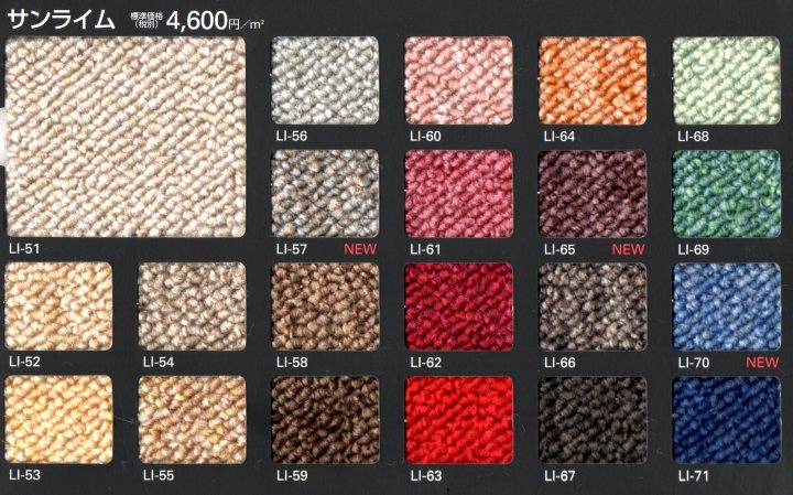加工費 本体+¥7100 本体51975+加工7100= 小計¥59075 8帖オーバーロック加工仕上げ 10%税込 計 ¥64982 8帖中級品相場、約6万5千円 プラス のりべた付け施工した場合 本体+¥12600 フェルトを敷き込んでグリップ施工した場合 本体+¥25200 例5 同サンライムU ¥5500/u サイズ約10帖 352*440p 平場15.8u 本体定価¥ プラス オーバーロック加工(直線)した場合 加工費 +¥8,000 本体65175+加工8000= 小計¥73175 10帖 オーバーロック加工仕上げ 10%税込 計 ¥80,492 10帖中級品相場 約8万円 詳しくはお見積りをご依頼ください。 時期によりモデルチェンジ等でホームページと 店頭の詳細や価格が異なる場合がございます。 およそのかかるご予算・費用・相場をホームページ上でご確認・ ご了解の上ご連絡ください。 複数社による相見積もりの依頼はご遠慮下さい。 *2021年現在 下記見本よりモデルチェンジやメーカー値上げにより 生地と価格が若干異なります。 10帖以上のサイズ352×440や2階以上は重くて運べませんので 申し訳ございませんがお引き受けできません。