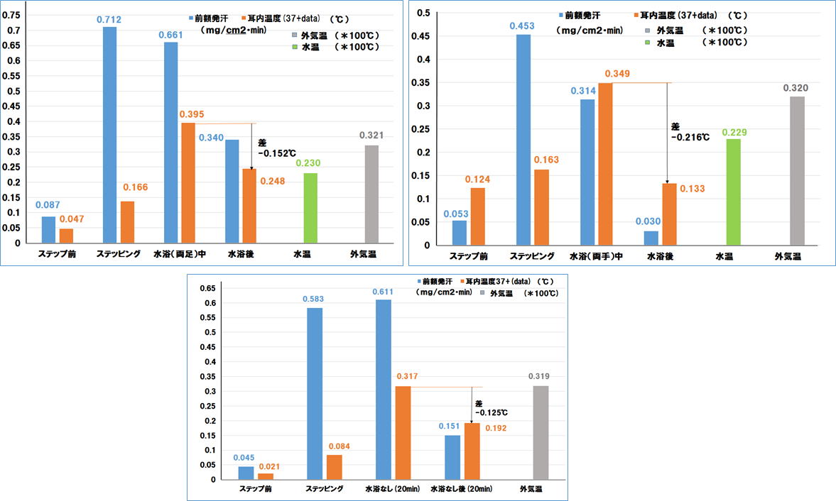 ステップ前10分間、ステッピング運動中の20分間、水浴中の20分間、水浴後の20分間の前額発汗量、耳内温度の各平均値を示したグラフである。ステッピング運動後に両足底、両手手掌を約22℃の水槽に浸すと、AVA血管が冷却され、AVA血管が閉じ、暖かい血液が流れなくなり、水浴なし時と比較して顕著に耳内温度が低下した。